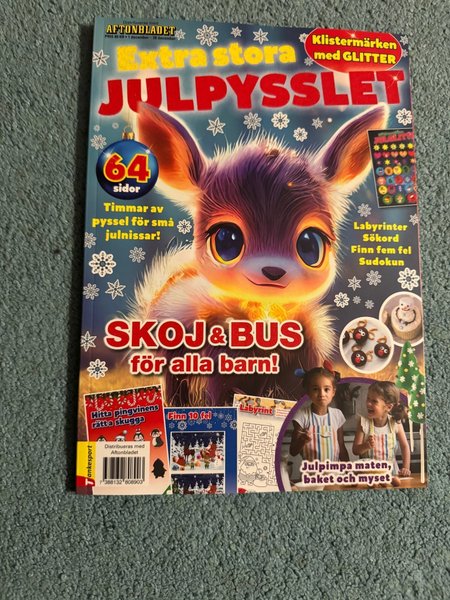 Extra Stora Julpysslet med klistermärken med glitter. Tidning innehåller labyrinter, sökord, hitta fem fel och Sudoku. ISBN: 7388132808903