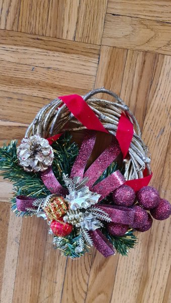 En mindre julkrans med röda och guldfärgade dekorationer. Mått i diameter ca 16 cm.