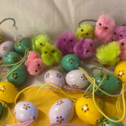 Parti med påskägg och påskpynt. Innehåller ett påskägg med kycklingmotiv och flera små hängande påskägg i olika färger och material.till påskriset