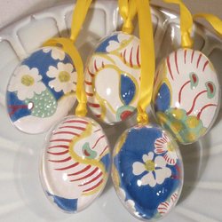 Handgjord av mig påskpynt med välkända motiv, som dekorerade med decoupage teknik (med servetter). Antal 10 stycken, material plast.