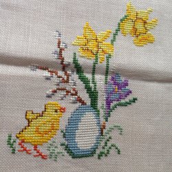 Broderad påskduk med motiv av påskliljor, krokus, kycklingar och en liten nyckelpiga.