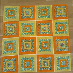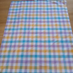Duk med motiv av kycklingar. Duken har ränder i vitt, gult och grönt. Den har fransar längs kanterna.
