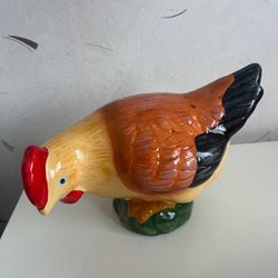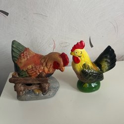 Två gula kycklingar som påskpynt. Den ena kycklingen har en blå rosett på huvudet och ett blått förkläde. Den andra kycklingen har en vit kockmössa. De är 10cm höga och i gott använt skick. Några små färgbortfall förekommer.