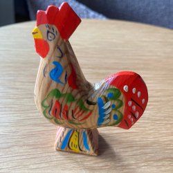 Retro välvårdad påsk tupp i trä med fjädrar.