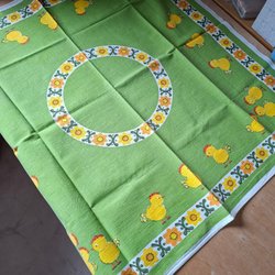 Fem påskpynt i form av kycklingar. Två av kycklingarna är större och står individuellt. De andra tre är mindre och arrangerade i scener: en kyckling i en blomsterkorg, två kycklingar i en korg, och en kyckling med en rosett på huvudet som står vid ett staket med en liggande kyckling framför sig.