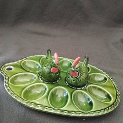 Fint äggfat format som en höna med plats för 6 ägg eller ägghalvor.