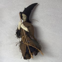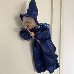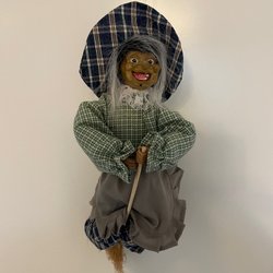 Häxdocka med kvast. Dockan har grått hår och är klädd i en rutig och randig klänning med förkläde. Kvasten är fäst vid dockans hand med ett snöre. Dockan är 25 cm hög.