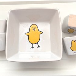 Kyckling m en godisskål som kvittrar när man trycker på knappen bak. 12cm hög, 12cm bred, 7cm djup. Vikt 194gr.