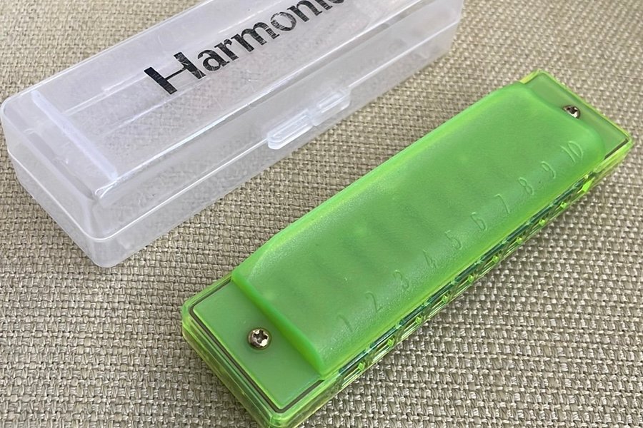 Enkelt munspel med etui i plast, C-dur. Grön färg
