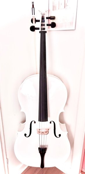 Säljer en vit vacker cello med båge, rosin och fodral i full storlek.Varmt ljud tack vare granträ. Från Gearmusic.