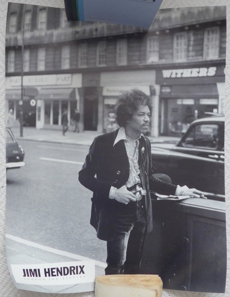 En svartvit poster av Jimi Hendrix i London. 42 X 54. Papprör, använder " Privatpost ".