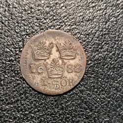 2 Öre mynt från 1666. Observera att myntet har ett hål.