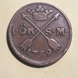 Ett kopparmynt med årtalet 1763 präglat. Myntet har valören 1 ÖR S.M.