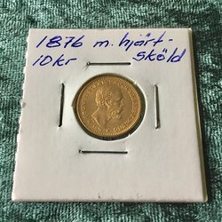 Fyra äldre svenska mynt. Inkluderar 5 öre från åren 1876, 1884, 1885 och 1905.