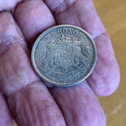Ett samlarobjekt från 1876 med Oscar II på ena sidan och texten "Sveriges och Norges Konung". På den andra sidan finns texten "2 Kronor" och årtalet 1876.