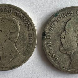 1 kr 1890, 50 Öre 1899, 25 Öre 1898, 1904, 1907. 10 Öre 1902, 1904