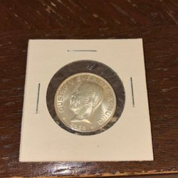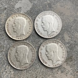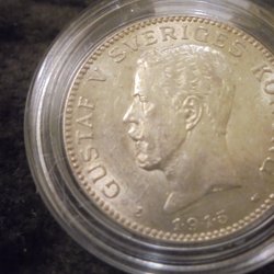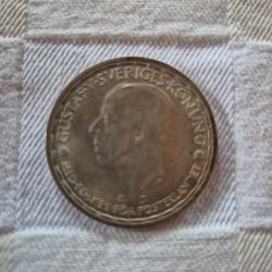 Silverfärgad minnesgåva med Gustaf V profil. Präglad med texten "GUSTAF V * SVERIGES KONUNG * MED FOLKET FÖR FOSTERLANDET". Baksidan pryds av "SVERIGES RIKSDAG 1435 1935 * 5 KRONOR *"