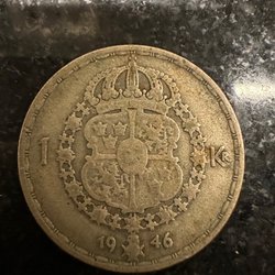 Silvermynt präglat 1946. Valören är 1 krona.