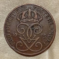 Svensk 5 Öre från 1909. Präglad med texten 'Med Folket För Fosterlandet'.