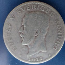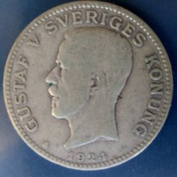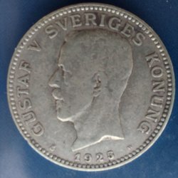 Silvermynt med Gustav V präglat, från 1929. Valören är 1 krona.