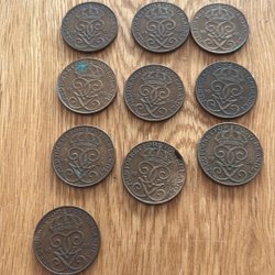 5 öringar från Sverige, präglade år 1916, 1920, 1923, 1926. Framsidan visar valören ”5 FEM ÖRE” och baksidan har texten ”FÖR FOSTERLANDET MED FOLKET.