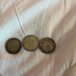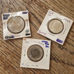 Tre svenska mynt från 1945, 1947 och 1948. Varje mynt har ett värde av 1 Kr med total 8,4 g. silver