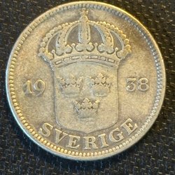 Detta är ett äldre svenskt samlarobjekt från 1938 med ett värde av 50 öre. Objektet är präglat med texten "SVERIGE" och har en kunglig krona samt tre kronor.