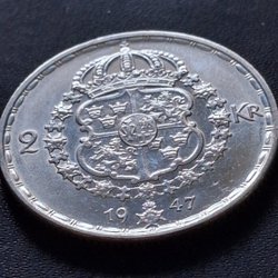 Detta är en svensk 2 KR från 1947. Framsidan visar Gustaf V och texten ”GUSTAF V SVERIGES KONUNG MED FOLKET FÖR FOSTERLANDET”. Baksidan visar Sveriges riksvapen och valören ”2 KR” samt årtalet ”1947”.