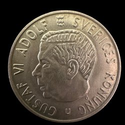 Ett exemplar av Gustaf VI Adolfs 2 kronor. Präglad 1952. Värde 2 kr.
