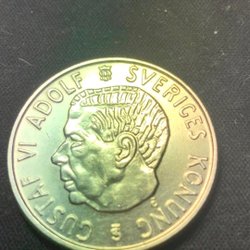Ett svenskt minnesmynt med Gustaf VI Adolf. Årtal och värde framgår av myntet.