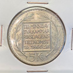 Minnesmynt från 1966 med valören 5 kr. Präglad till minne av tvåkammarriksdagens tillkomst 1866.