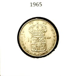 Denna valuta är från Sverige, präglad år 1965. Den har ett värde av 1 krona.