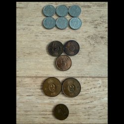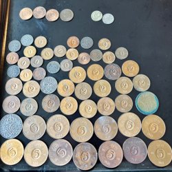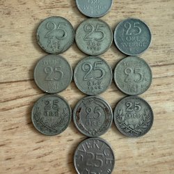 Parti med 8 svenska ören. Framsidan visar "SVERIGE" och baksidan visar valören "5 ÖRE" och årtal. Årtalen är 1972, 1973, 1979 och 1980.