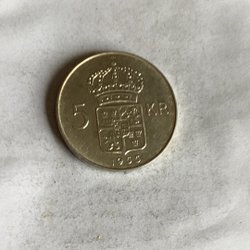 Detta är en svensk 5 KR från 1955. Framsidan visar Konung Gustaf VI Adolf och baksidan visar Sveriges riksvapen under en krona.