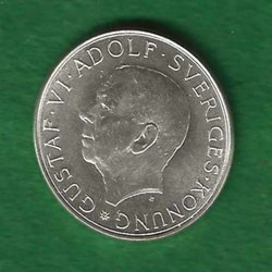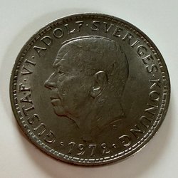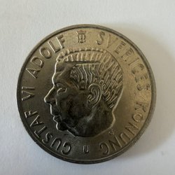 Svensk 2 krona från 1971 med Gustaf VI Adolfs porträtt. Valören är 2 kronor.