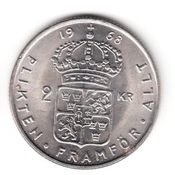 Ett äldre svenskt mynt från 1958 med valören 2 KR. Framsidan visar ett porträtt av Gustaf VI Adolf. Baksidan visar Sveriges riksvapen.
