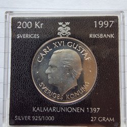 Silvermynt präglat 1997 med Carl XVI Gustafs porträtt. Myntet har ett värde av 200 kr och är tillverkat i silver 925/1000. Vikt 27 gram.
