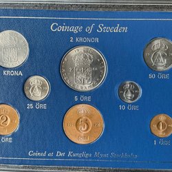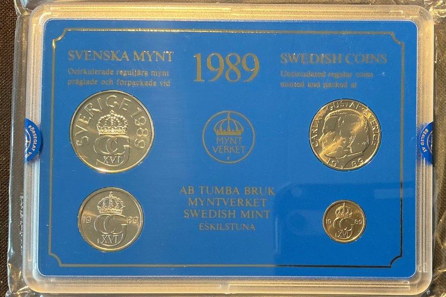 Detta set innehåller ocirkulerade svenska mynt från 1989, präglade och förpackade av AB Tumba Bruk Myntverket i Eskilstuna. Mynten är förseglade.