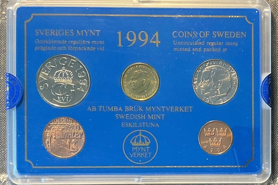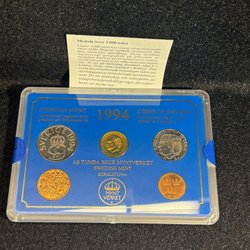 Denna myntuppsättning från 1994 innehåller ocirkulerade svenska mynt, präglade och förpackade av AB Tumba Bruk Myntverket i Eskilstuna.