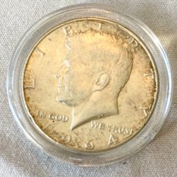 Detta är en Kennedy Half Dollar från 1964. Framsidan visar John F. Kennedys profil och baksidan visar USA:s presidentemblem. Valören är en halv dollar.