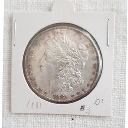 Denna amerikanska silverdollar är från 1884 och har ett värde av en dollar. Framsidan visar ett porträtt av Lady Liberty och baksidan visar en örn med utbredda vingar.Mycket fin!