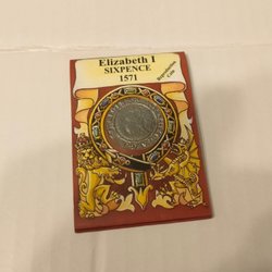 En samling av diverse valutor förvarade i en trälåda med lock av metall. Locket har en bild av ett djur. Årtal och värde kan förekomma på vissa av valutorna.