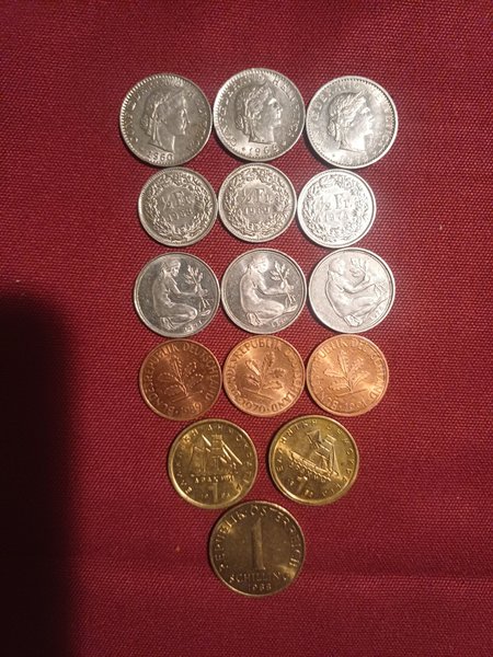 En samling av äldre valutor. Inkluderar Schweiziska franc från åren 1960, 1969, 1975, 1968, 1969, 1974, 1991 och 1978. Tyska mark från åren 1989, 1970 och 1991. Grekiska drachmer från 1982 och Österrikiska schilling från 1988.