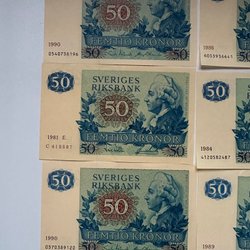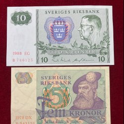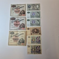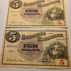 Tre äldre sedlar. En Indonesisk sedel, värd 100 Rupiah från 1992. Två stycken Svenska 5 kronor sedlar, en från 1977 och en från 1956. De är i okej skick lite slitna och kanterna är inte perfekta. Skicka bara meddelande ifall ni undrar något
