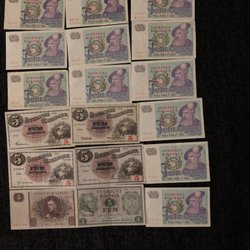 Samling av svenska sedlar. Innehåller: 5 Kronor från 1968 (serienummer G 521615), 5 Kronor från 1981 (serienummer A 353990), 5 Kronor från 1978 (serienummer C 343576), 10 Kronor från 1955 (serienummer B 024617) och 5 Kronor från 1965 (serienummer B 142941).