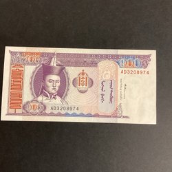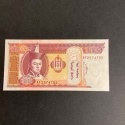 Denna mongoliska sedel har ett värde av 100 Tögrög. Sedeln är från 2014 och har serienummer NJ0083571.