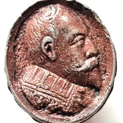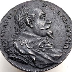 Åtsida: Konung Gustav II Adolfs nästan helt framåtvända bröstbild, vänd åt höger, iklädd harnesk med nagelrosett över konungens högra axel, fältbindel uppfäst över axlar och bröst.
