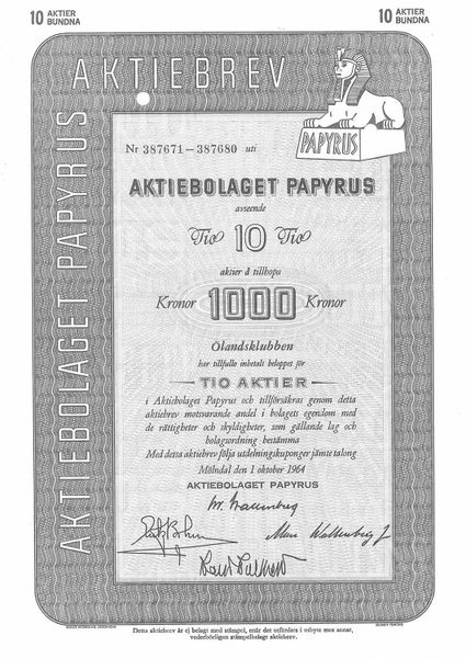 Papyrus, AB, 1 000 kr, 1964, Mölndal, dek, mak.