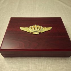 Säljer ett vackert träetui för myntförvaring. Det är i en rödaktig design och dekorerad med ett emblem i metall föreställande en guldfärgad krona omgiven av vita stenar.