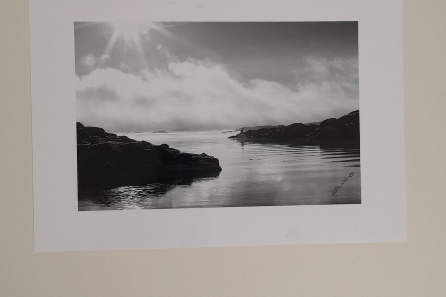 A4 Str. Svartvitt fotografi, Dimmorna skingras bland holmar och klippor med havet som bakgrund på Stångehuvud i Lysekil.